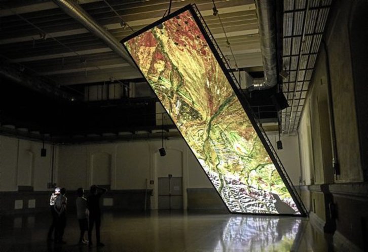Con motivo de la celebración de su quinto aniversario, el Centro Internacional de Cultura Contemporánea Tabakalera de Donostia inauguró el pasado 11 de septiembre y hasta el próximo día 12 la instalación “Supraspectives”, a cargo del colectivo Quadrature de Berlín, formado por Juliane Götz y Sebastian Neitsch. La pieza ha sido desarrollada en colaboración con Ars Electrónica y el Donostia International Physics Center. Conceptualmente estamos ante una pieza que nos proporciona la información de 590 satélites espía que sobrevuelan nuestras cabezas y que han sido captados para la realización del proyecto. Muchos de ellos están obsoletos y se han quedado orbitando sin posibilidad de descender de nuevo. Si bien esta idea es de por sí interesante, el reto del proceso se encuentra en cómo convertir esa investigación en un dispositivo capaz de funcionar como una instalación artística. Asimismo, que nos permita, como público, acceder a toda esa información con un lenguaje cercano y reconocible. Es innegable admitir que Quadrature realiza un trabajo exquisito consiguiendo hacer esa “traducción”.