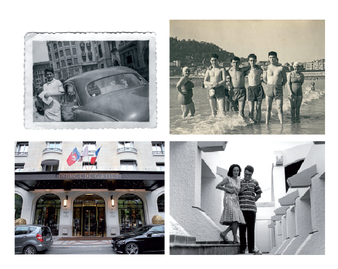 Baigorri, adolescente como pinche del Hotel Yoldi, en Iruñea, y a lado, en 1957 (el primero por la izquierda), con amigos en la donostiarra playa de La Concha. Bajo esta foto, con Colombia Moya en La Habana. Sobre estas líneas, el Hotel Príncipe de Gales (París), en el que fue un chef de éxito.
