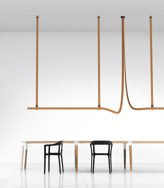 Diseñada por los hermanos Bouroullec para Flos, Belt juega con la idea y la discreción de un cinturón y la adapta a una familia de luminarias innovadora y elegante. La línea de luz técnica está envuelta en una fina capa de cuero cosido a medida, que integra a la perfección cada elemento de la composición para conseguir una línea sinuosa sin interrupciones aparentes. El cuero representa el corazón del proyecto. Un material suave y cálido que garantiza libertad en el espacio pero al mismo tiempo se caracteriza por una cierta rigidez que crea armonía en el resultado de la composición final. Cada elemento del producto se controla con tiras de cuero. Algunas soportan el peso del aparato, otras llevan electricidad y algunas contienen luz. La sección inicial de cada composición desciende desde el techo o se eleva desde la pared o incluso desde el suelo y luego se cuelga gracias a unas tiras específicas para ello. Como para abrochar un cinturón, la instalación de las tiras utilizadas para colgar el perfil luminoso se realiza deslizando las correas de cuero a través de hebillas metálicas específicas que actúan como ganchos de techo. Cada tira se puede ajustar para respetar la configuración del entorno. ¿Y el interruptor? Belt tiene un micro conector integrado en el terminal del perfil luminoso que permite realizar la conexión eléctrica con un simple clic. Una maravilla. www.flos.com