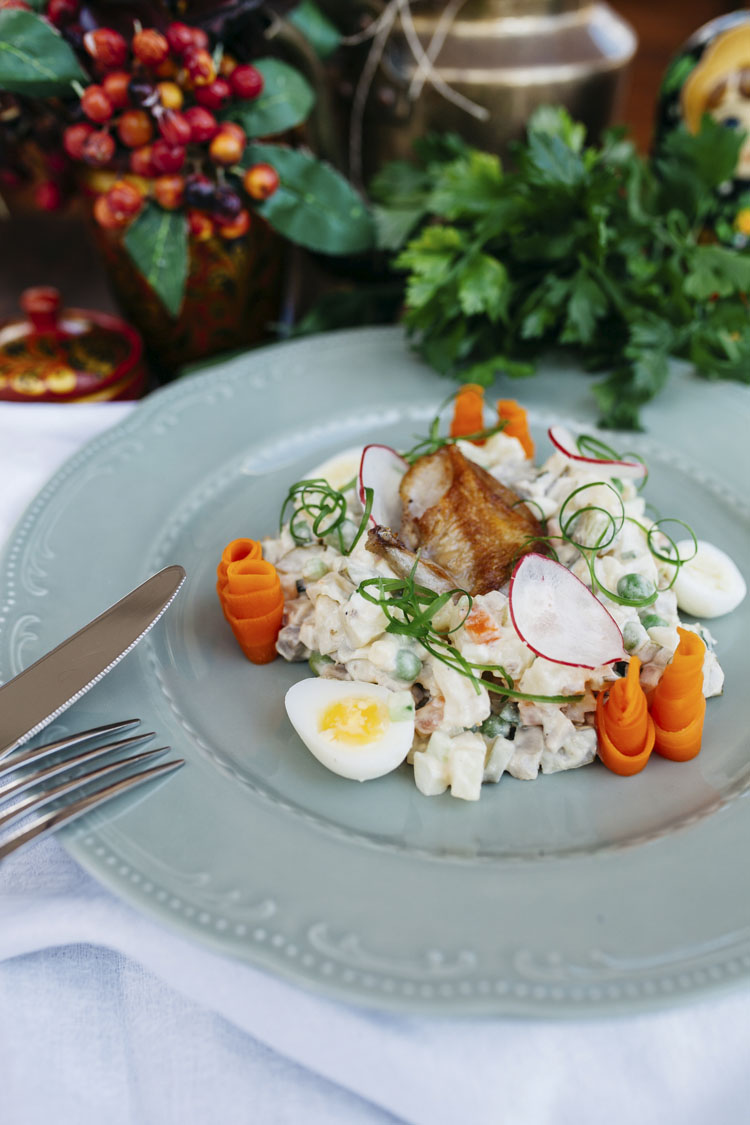 Para empezar, ¿por qué rusa? Pues porque viene de Rusia. O, bueno, eso dice la teoría más extendida. La que habla de un tal Lucien Olivier (cocinero francés de origen belga), que en su restaurante “Hermitage”, en Moscú, se hizo famoso por una ensalada. El caso es que el restaurante de este señor fue todo un éxito y la alta sociedad rusa rápido se enganchó a la alta cocina que se ofrecía en este local. Originalmente, la ensalada que terminó por llamarse como su creador (Olivier), se llamaba “mayonesa de caza”. ¿Qué ingredientes la hicieron tan famosa? Apuntad: carne de urogallo o perdiz, áspic, cangrejos, caviar, lengua de ternera, trufa, además de lechuga, pepinillos, patatas cocidas y aceitunas. Todo iba aliñado con una salsa cuyo secreto se llevó Olivier a la tumba y que fue imitada a base de mayonesa, aceite de oliva, vinagre de estragón, mostaza y salsa Mogul o Kabul (que podría ser similar a la de soja). Igualita a la que nos pondrá la amona este fin de año.