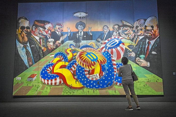 El pasado julio, el Museo de Bellas Artes de Bilbo presentó una serie de donaciones recientemente incorporadas a su colección. Entre ellas se encontraba el mural “Lemoiz Gelditu”, que se expuso el pasado noviembre en la sala 32 del museo y que podrá visitarse hasta el próximo 1 de febrero del año 2021. La pieza está compuesta de doce paneles cuyo montaje final alcanza un imponente tamaño de más de 7 metros de largo por 4 de alto. La obra data de 1980 y fue creada por Vicente Ameztoy (Donostia, 1946-2001), José Luis Zumeta (Usurbil, 1939-Donostia, 2020) y Carlos Zabala “Arrastalu” (Irun, Gipuzkoa, 1952). Los artistas fueron invitados por el movimiento antinuclear vasco a unos encuentros populares en contra de la construcción de la central nuclear. Durante aquellas jornadas y sobre unos andamios, la pintura fue creada en directo a la vista del público y llega hasta nuestros días como una constancia de la trayectoria de los movimientos sociales en Euskal Herria así como del compromiso político de algunos creadores. La obra utiliza un lenguaje muy cercano a la gráfica popular para representar a personajes identificables con los organismos de poder tales como el ejército o los poderes económicos que se sientan alrededor de una gran mesa. En ella, varias serpientes con banderas dibujadas en su piel conquistan la naturaleza mientras diminutos activistas intentan pelear contra ellas.