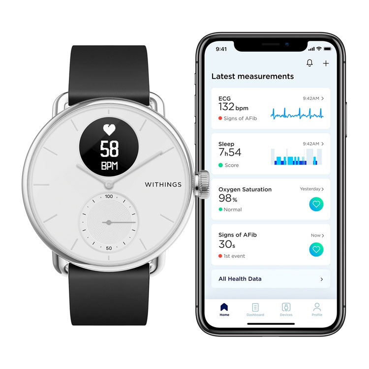Withings comercializa este avanzado reloj inteligente híbrido que escanea parámetros vitales para detectar problemas de salud. Para ello integra un ECG de grado médico, oxímetro para medidas SpO2 y control de alteraciones respiratorias durante el sueño. Desde 280 euros.