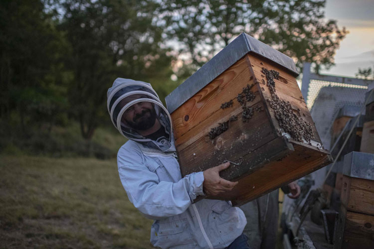 Las carga a mano, lo que, teniendo en cuenta el volumen, ya es mucho. Opera con material sensible y vivo, puesto que cada una de estas cajas, que pesan unos 30 kilos, llevan dentro una abeja reina y miles de recolectoras. Ellas se encargarán de producir toneladas de miel que luego acabarán en nuestras gargantas. Teniendo en cuenta las picaduras de las abejas, estamos ante un trabajo de alto riesgo. Para calmarlas hay fórmulas como el fumador de humo frío de hierbas secas, que recuerda a una regadera, y se expande a la entrada de las colmenas.