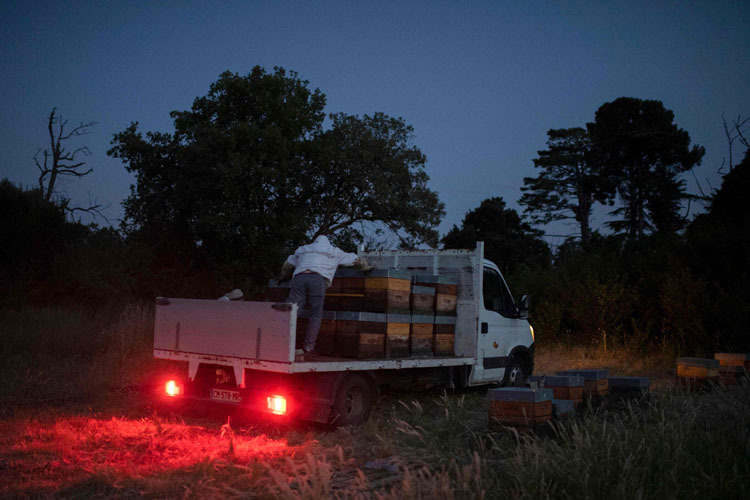 De ello se encarga Patrice Parrocel, un apicultor de 36 años que, después de que las abejas regresen al atardecer a sus colmenas, espera al anochecer para cargar en la parte trasera de su camión medio centenar de colmenas que emprenderán un recorrido de 30 kilómetros que empieza en su lugar de residencia, en Volx, y acaba en el campo de la fotografía. Una ruta que será algo más larga para el apicultor, pues deberá efectuar unos catorce viajes para poder transportar las 700 colmenas con las que trabaja, a 50 por trayecto.