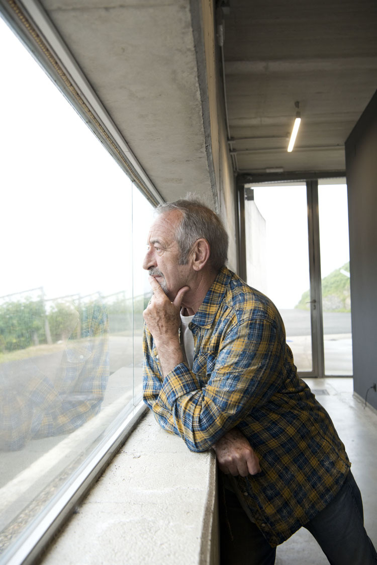 Antes de iniciar la entrevista (si a esto que usted va a leer se le puede calificar como tal dada la informalidad de la cita), saluda a una pareja que se encuentra en el interior de la bodega. «Creo que son de Gijón, voy a saludarlos». Entra y se acerca como si fuesen uno más de su casa, les pregunta por su procedencia y por la calidad del vino que elaboran de principio a fin en este edificio hormigonado que en su interior guarda un caldo de importante calidad.