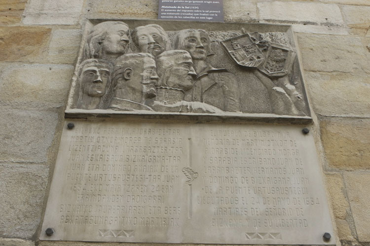 Rebelión de la sal. Comenzamos el recorrido en la famosa Iglesia de San Antón, situada en el Casco Viejo, a orillas de la ría. En la fachada que da a las siete calles podemos observar una placa que contiene seis caras y los escudos de Bilbo y Bizkaia. «Mártires del Señorío de Bizkaia y de su libertad», se puede leer en una placa bajo los nombres de Martin Otxoa de Aiorabide, Licenciado Morga y Sarabia, el escribano Juan de Larrabazter, los hermanos Juan y Domingo de Bizkaigana, y Juan de la Puente Urtusaustegui.