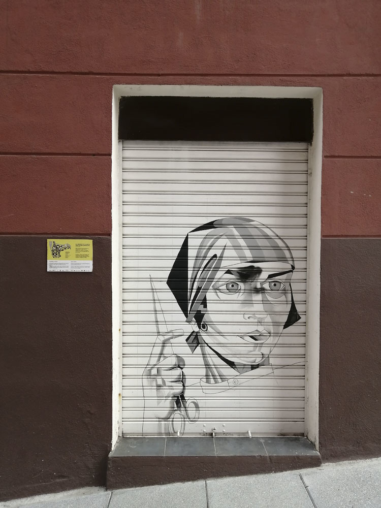 Varias calles más arriba, adentrándonos ya en el barrio de Zabala, encontramos un grafiti pintado por Laura López Bello en una persiana donde se puede observar el rostro de una mujer que porta en su mano una tijera y un dedal. A simple vista parece un dibujo sin más, pero hay algo detrás. Tal y como explica un pequeño panel colocado al lado, se trata de un homenaje al Sindicato de la Aguja, el primer sindicato de mujeres del Estado español, fundado en 1911.