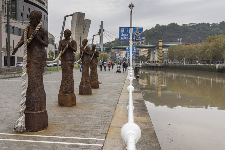 Sirgueras. Caminando por el muelle de Uribitarte podemos ver junto a la ría un grupo escultórico creado por Dora Salazar llamado “Las sirgueras”. Las sirgueras eran mujeres que, especialmente durante el siglo XIX, tiraban desde la orilla de barcazas o gabarras con mercancías trasvasadas de barcos que no podían remontar el cauce de la ría por falta de calado o de viento. Lo hacían a través de una sirga, que era un cabo sujeto a su cuerpo por el hombro o por el pecho. Era una labor extremadamente dura y muy mal pagada, de hecho anteriormente ese trabajo lo realizaban los bueyes y después los barcos a vapor.