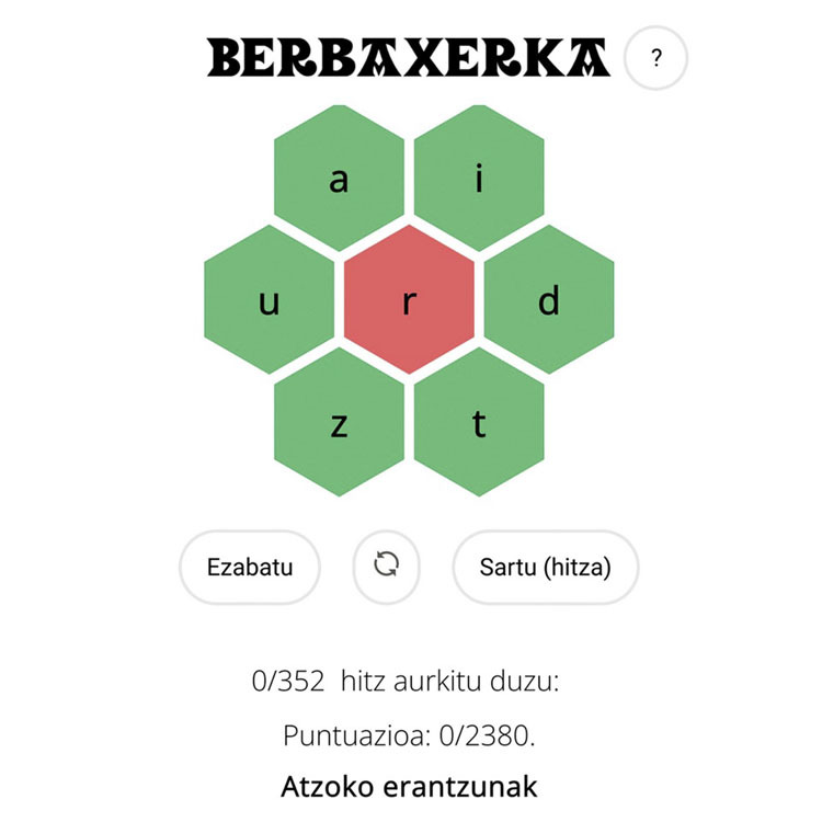 Junto al éxito de Spelling Bee, el rompecabezas para buscar palabras en inglés cada día, aquí tenemos este adictivo entretenimiento para hacerlo con palabras en euskara con al menos cuatro letras y utilizando siempre la letra central, aunque siempre hay una con las siete.