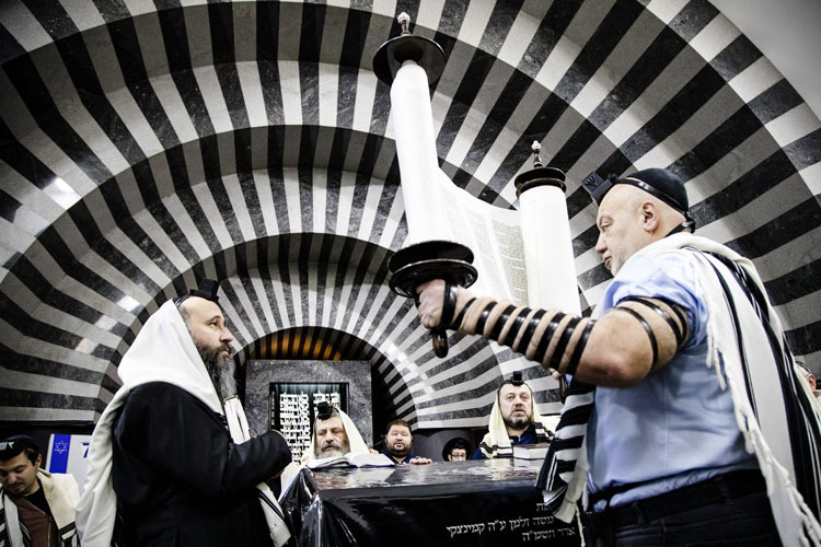 Judíos rezando en la sinagoga de Dnipro, la mayor del mundo y financiada por dos conocidos oligarcas ucranianos.