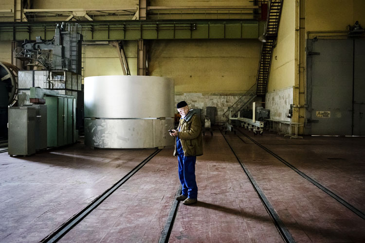 Un trabajador de la fábrica Yuzhmash donde antiguamente trabajaban miles de empleados fabricando alta tecnología espacial. Hoy en día apenas tienen encargos y las instalaciones languidecen.