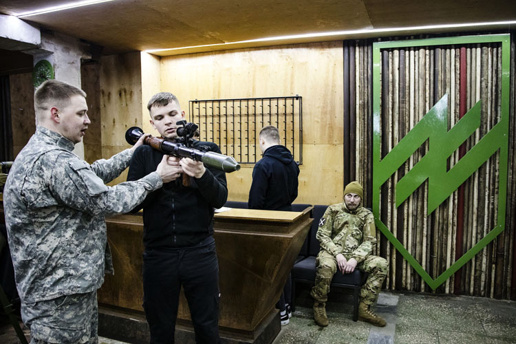 Un miembro del batallón de extrema derecha Azov enseña a utilizar un lanzacohetes a un civil en Kiev.