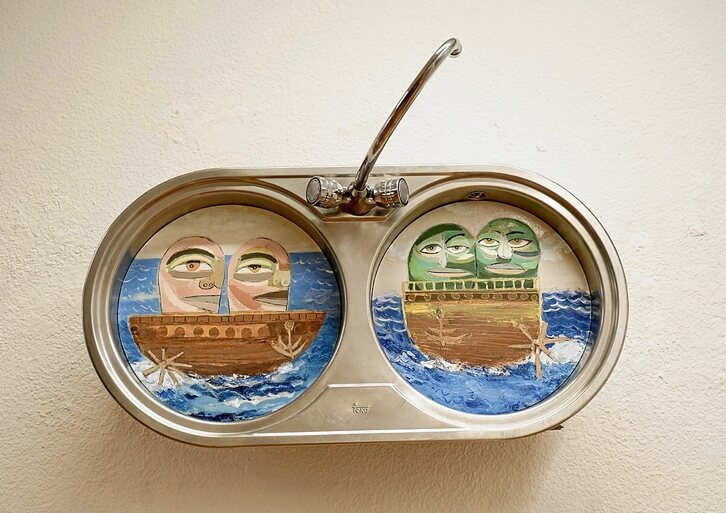 La Galería de Arte Juan Manuel Lumbreras de Bilbo inauguró a finales de abril una exposición a cargo de los artistas Fernando y Vicente Roscubas (Palma de Mallorca, 1953). Ligados al contexto vasco desde su infancia, esta pareja creativa formada por dos hermanos gemelos nos presenta hasta el 2 de junio su propuesta “De lo perceptual a lo absoluto”. Los hermanos Roscubas pertenecen a una generación muy marcada por el nacimiento de una nueva identidad basada en la influencia de Jorge Oteiza y la escultura. A pesar de eso, caminaron por otros derroteros más cercanos al expresionismo abstracto y al arte pop. Las obras que encontramos en la galería bilbaina no pretenden realizar un camino retrospectivo por su trayectoria. Hay piezas de realización reciente junto con creaciones de años anteriores. Esculturas, composiciones digitales y collages, son varios de los ingredientes que marcan el recorrido de la muestra. Su vinculación con la cultura popular nos hace encontrar rostros reconocibles, imágenes cercanas a lo publicitario e incluso acabados cercanos al diseño, al humor gráfico o a la ilustración. Un gran ciempiés de color negro brillante, realizado en fibra de vidrio, o un futbolín con los jugadores suspendidos en el aire son algunos de los trabajos protagonistas. En todos ellos parecen existir rasgos humorísticos. Juegos irónicos que sin pecar de obviedad nos activan ciertos estados de alerta que nos acompañarán durante la visita.
