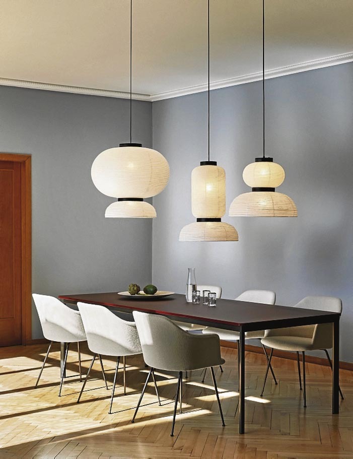 El diseñador madrileño Jaime Hayón fusiona Oriente y Occidente en este diseño para la editora danesa &Tradition. La lámpara reinterpreta la forma del clásico farolillo chino al que Hayón le da un aire moderno que encaja perfectamente con cualquier estilo. La pantalla es de papel de arroz, lo que proporciona una iluminación cálida muy agradable. Hayon ha renunciado a las formalidades culturales para crear una serie de lámparas en blanco que están fabricadas a mano con papel de arroz fusionando varios tamaños y formas. La serie se compone de tres versiones diferentes y una lámpara de mesa en papel de arroz blanco marfil con detalles de roble teñido de negro.