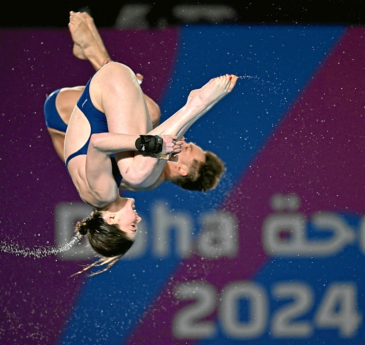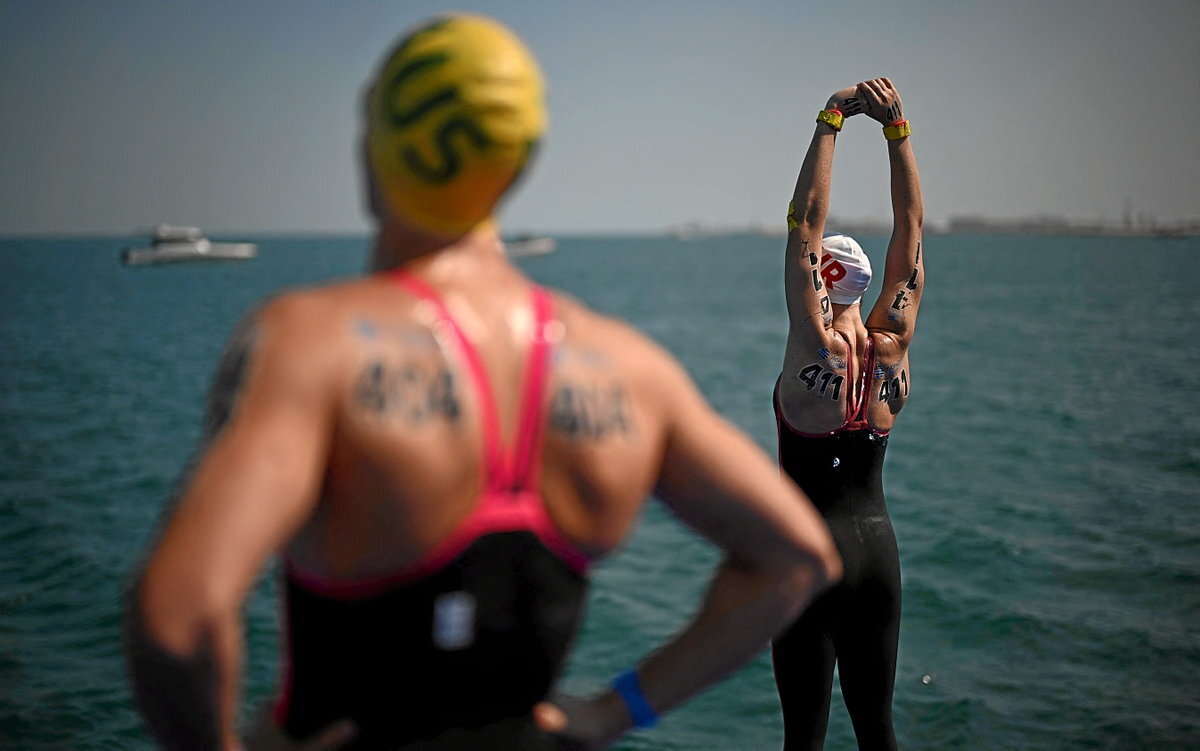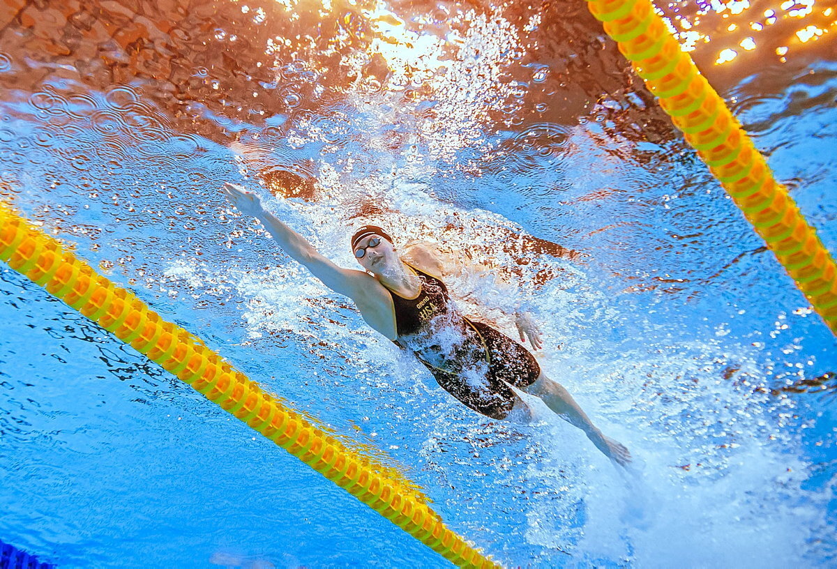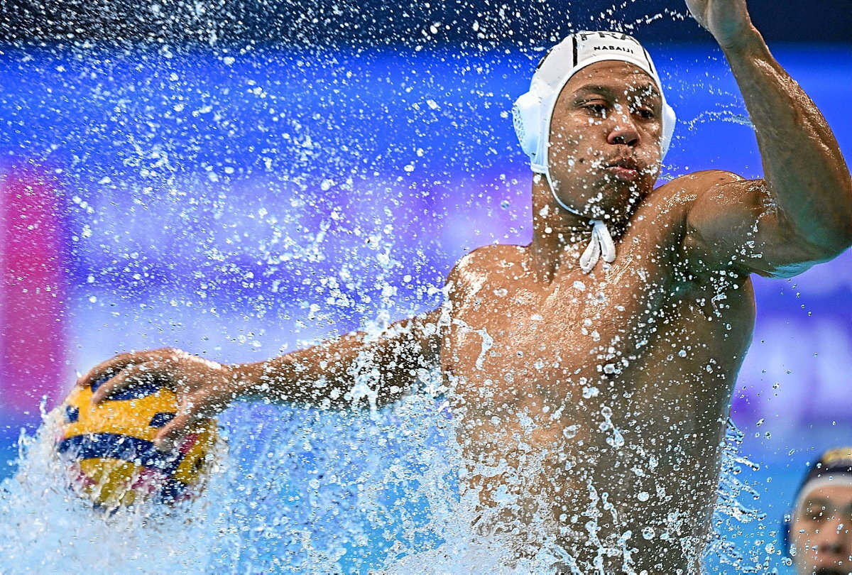 El waterpolista Thomas Vernoux emerge en la pileta dispuesto a lanzar el balón. Debajo, la estadounidense Kate Douglass compitiendo en la final de 200 metros estilos; la victoria le permite conservar su título.