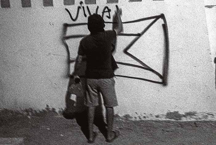 En una calle cercana a una comisaría de policía, un activista pinta una bandera de la RASD. Portar o desplegar una bandera de la RASD está considerado como alta traición a la nación y al rey de Marruecos, y conlleva una pena mínima de 6 años de cárcel, que se puede alargar hasta cadena perpetua.