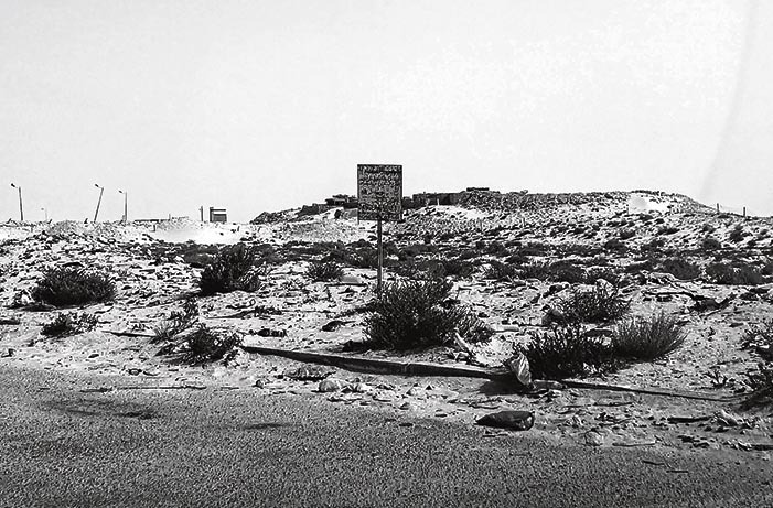 El paso de Guerguerat es la zona con más densidad de minas antipersona y anticarro del mundo. En la imagen se puede ver un cartel de advertencia de minas más allá del alambrado y, detrás, un fuerte militar marroquí que invade la zona neutra. Al fondo, una torre de control marroquí utilizada para radar.