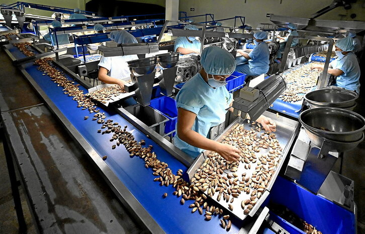 Trabajadoras de la empresa Tahuamanu seleccionan nueces de Brasil en Cobija, Bolivia, una ciudad en la frontera con Brasil ubicada a 1.200 kilómetros de La Paz. Ellas forman parte de las 300.000 personas dedicadas a la industria de las también llamadas castañas de Pará, cuya supervivencia se está viendo afectada. Miles de recolectores están inquietos por el avance de la deforestación, que está mermando la producción de este fruto de los bosques tropicales. Con 400.000 hectáreas destruidas, hace dos años Bolivia fue uno de los tres países del mundo que más bosque tropical perdió. Los incendios forestales están asfixiando a la Amazonía y el Gobierno señala a colonos y empresarios agroindustriales de estar detrás de las quemas en su intento por expandir la frontera agrícola. La castaña se produce de forma natural, sin fertilizantes ni plaguicidas, solo a través del proceso de polinización que involucra a insectos como las abejas o mamíferos roedores como el jochi. Las castañas provienen del Bertholletia excelsa, un árbol que puede alcanzar los 60 metros de altura y vivir hasta mil años. Este fruto seco está considerado como un superalimento; es una fuente rica en nutrientes esenciales como vitamina E, selenio, magnesio y grasas saludables. Bolivia es uno de sus principales productores y el 90% de su producción se distribuye en Brasil, Países Bajos, Estados Unidos, Gran Bretaña y Alemania.