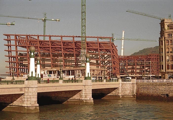 Sus propietarios -era de titularidad privada- querían aprovechar su destacada ubicación para sacarle rendimiento. Se convocó un concurso público y se aprobó un primer proyecto en 1965 pero, debido a su dificultad de construcción, fue desechado finalmente. En 1972, la sociedad propietaria acordó su derribo, en medio de la polémica, dado que era uno de los edificios más emblemáticos de la ciudad. La realidad es que estaba en quiebra, en concurso de acreedores. El solar pasó a ser de propiedad municipal y fue bautizado como “solar K”. Tras la corrección de ciertos aspectos del proyecto de 1972, que no gustaban a los responsables municipales, la construcción del edificio comenzó en 1975. Sin embargo, las obras se paralizaron tras la construcción del muro perimetral y de su cimentación. El tiempo fue pasando y no fue hasta 1989 cuando se convocó una consulta técnica a la que se invitaron seis profesionales de renombre internacional: Peña Ganchegui, Mario Botta, Arata Izozaki, Norman Foster, Juan Navarro Baldeweg y Rafael Moneo. Fue elegida la propuesta de este último.