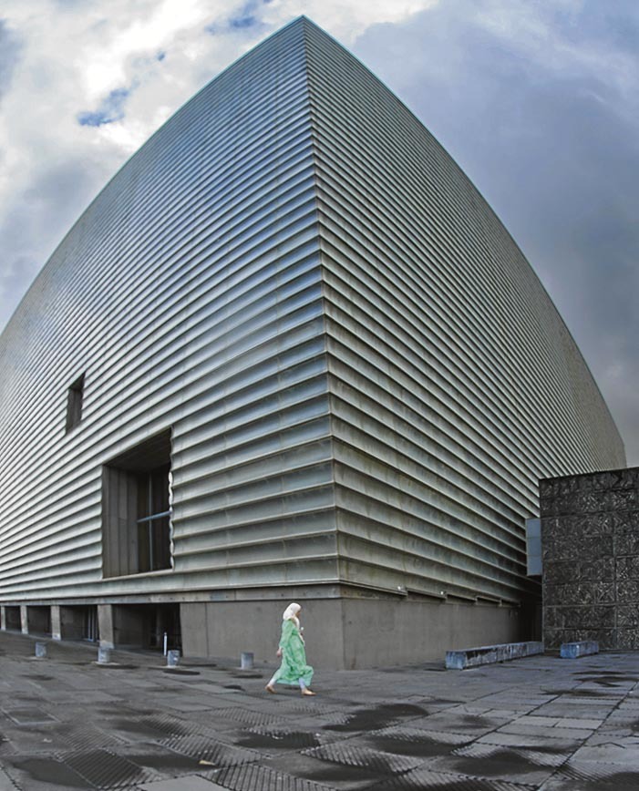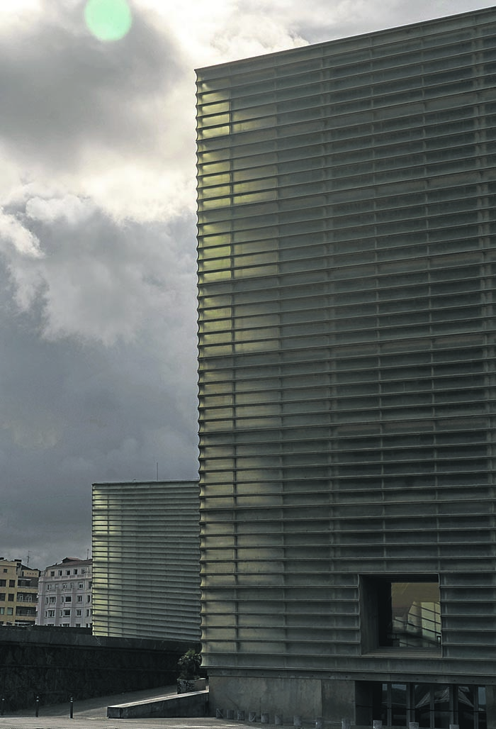 El propósito es difícil. Su función de auditorio requiere altura, el edificio pertenece a su potente naturaleza, por lo que surge el concepto de unos envolventes prismas inclinados de vidrio traslúcido que apuntan precisamente a las dos cumbres orográficas referenciales, Ulia y Urgull.