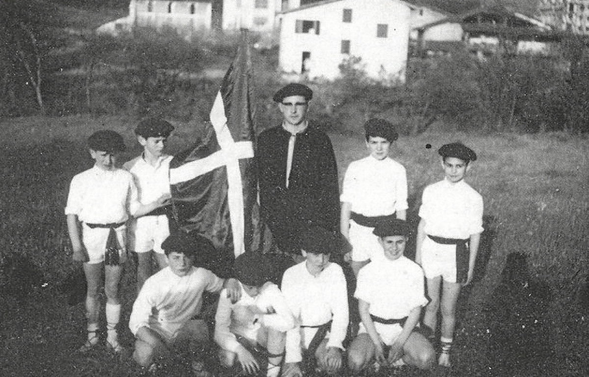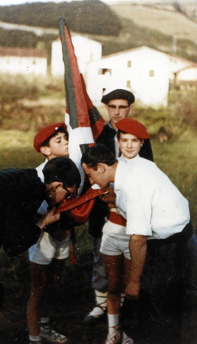 Juan Joxe Agirre con la ikurriña en Lazkao, en tiempos del franquismo. Euskal Memoria Funtsa - Lazkaoko Beneditarren Fundazioa