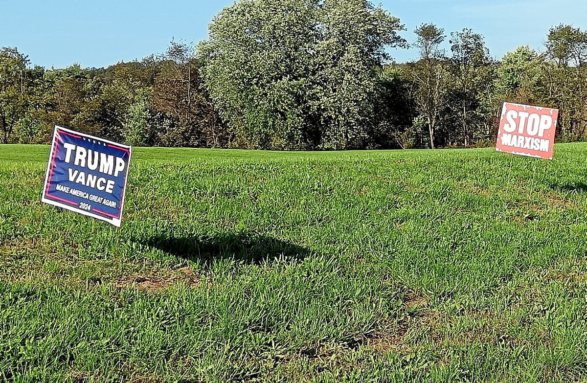 Etxalde bateko belardian, Trump-Vance-ren afixaren ondoan, “geldiarazi marxismoa” irakur daiteke. Beste batzuek ere demokratei zergak igotzea egozten die, eta Trumpek jaitsiko dizkiela, baita jarraitzaile errepublikanoen beste gai kutuna ere: armak. Udazken koloretako basoak, kalabaza eta orbel gorrituz Halloween-erako hornitutako etxaldeetako portxeak, eta Trumpen aldeko boto-eskea nagusi dira landa eremuko Pennsylvanian.
