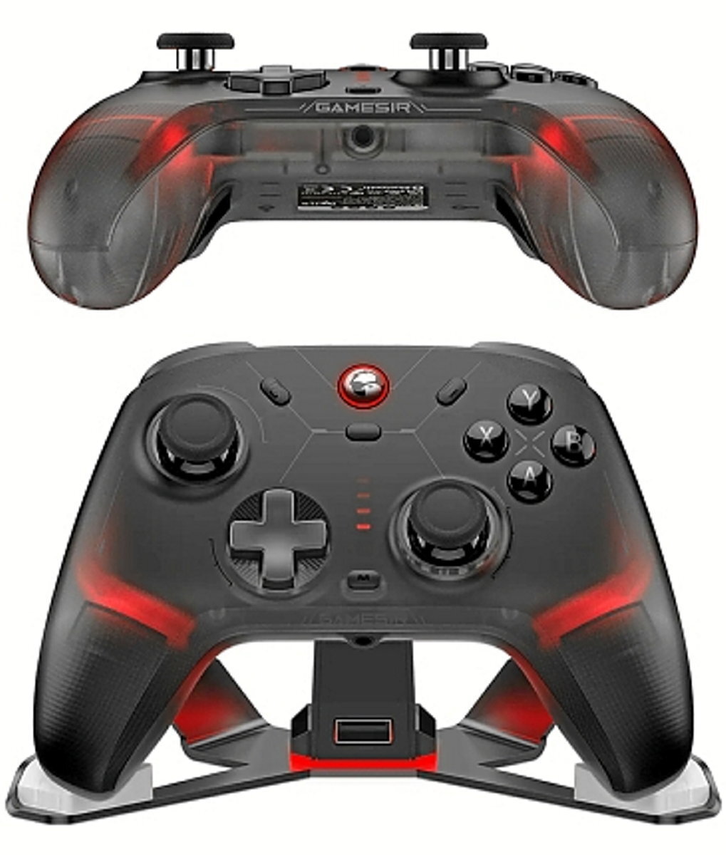 Este mando inalámbrico multiplataforma de GameSir se conecta vía Bluetooth o un receptor de 2,4 Hz a una Nintendo Switch, a un PC e incluso a un dispositivo móvil. Cuenta con gatillos analógicos, tiras RGB y una batería con 860 mAh. También se puede adquirir con estación de carga.