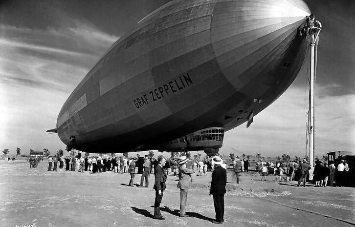 Gaurko egunez, 1930eko maiatzaren 18an, Graf Zeppelinak (LZ 127) Ozeano Atlantikoa bi aldiz zeharkatuko zuen hegaldia abiatu zuen, 27.000 kilometro inguruko distantzia osatzeko helburuz. Konde alemaniar batek, Ferdinand von Zeppelinek, bere herrialdean aire-nabigazioan aitzindaria zenak, bere izena eman zion orduan munduko aireontzirik handienari. 236,6 metroko luzera, 30,48 metroko diametroa eta 105.000 metro kubikoko bolumena zituen eta alemaniar zeppelin honek 129 km/h-ko abiadura maximoa lor zezakeen, 550 hp-ko Maybacheko bost motorren indarrari esker; 60 tonako karga ere garraia zezakeen. Bitxia bada ere, tripulazioak (40) bidaiari kopurua bikoiztu egiten zuen (20). Graf Zeppelin 1928ko irailaren 18an aireratu zuten lehen aldiz eta, urtebete geroago, 21 egunean munduari itzulia eman zion lehen bidaia gauzatu zuen. William Randolph Hearst magnateak bultzatu zuen eta Lady Grace Drummond kazetariak -ontzian zegoen emakume bakarrak- lekukotza lanak egin zituen 34.600 kilometroko bidaia hartan. Orotara, 600 bidaia egin zituen Graf Zeppelinak, Atlantikoaren gainean 150 aldiz egin zuen hegan eta Artikorako ikerketa polarreko hegaldi batean ere parte hartu zuen. Hego Amerikarekin karga- eta posta-bide arrunt bat ere ezarri zen haren bidez 1936an. Irudi honetan, hegazkina bere tamaina osoan ikus daiteke, baina argazki gehiago ere badago, horietako batzuk New York, Chicago, Berlin, Buenos Aires, Rio de Janeiro, Londres, Munich eta Jerusalemeko zeru gainean ateratakoak, baita Kairon, Moskun edo Madeiran ere. Zeppelina 1940an desegin zuten ehiza-hegazkinen piezak egiteko.