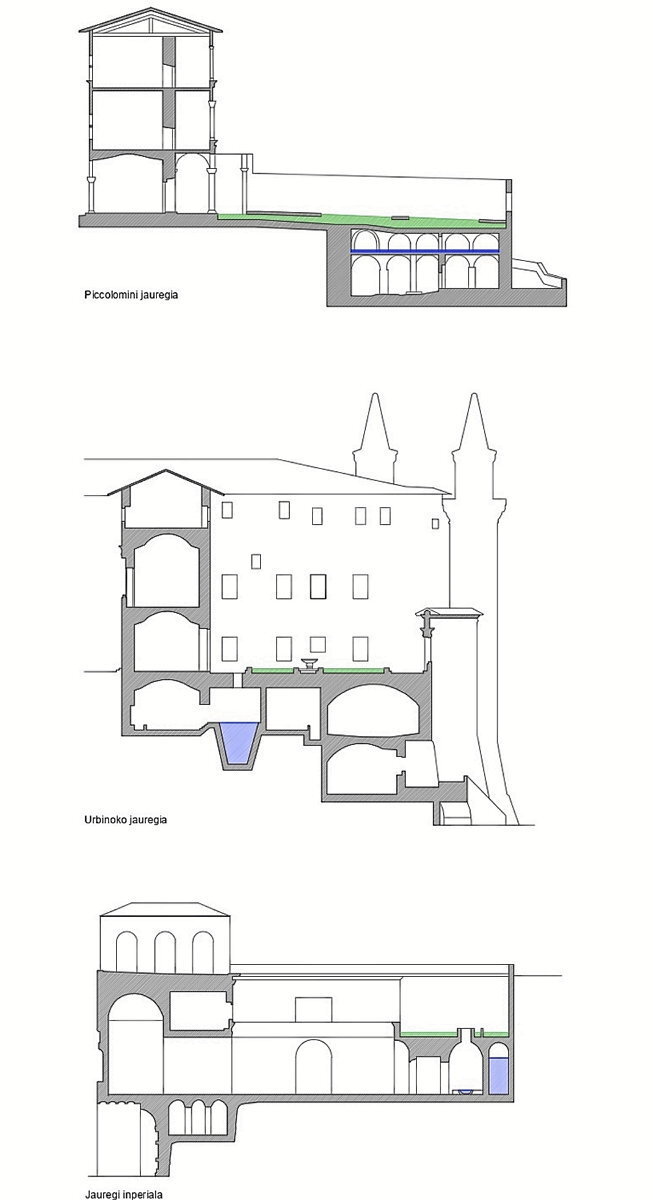 Urbinon, Ducale Palazzoak, (1455-1482), tradizio hori berreskuratu eta indartu egiten du. Hiriaren eta haranaren artean esekita, bere lorategi jasoa -hiri-egituratik ezkutatuta baina muinoetara zabalik- hortus conclusus delakoaren eta paisaian kokatzeko bultzada errenazentistaren artean kokatzen da. Parterreen lasaitasunaren eta harri zahartuaren azpian, Quattrocento garaiko sistema hidrauliko sofistikatuenetako bat zabaltzen da. Harlauzen azpian ezkutatuta, zeramikazko teilak dituen bigarren mailako teilatu batek euri ura jasotzen du, eta beheko mailetan dauden zisternetara doazen kanaleta eta hodi batzuetara bideratzen du.