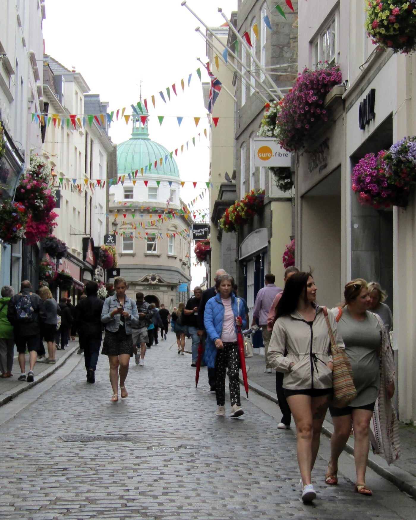 Duela 55 urte naziek uhartea okupatu zutenean baino askoz gutxiago entzuten da egun guerneseyera, uharteko berezko normandieraren aldaera, frantsesetik gertukoa. Hura dakitenen eta ikasten ari direnentzat ikastaroak eta topaketak antolatu ohi dira. Gainerakoan, Dix-Neuf jatetxeak kontinentetik datorren kutsu frantsesari eusten dio. Hiriko txokorik ederrenetakoan dago, Market Street eta High Street galtzadarrizko oinezko kaleak lotzen dituen kalexka baten amaieran (Commercial Arcade). Lehenak 1822ko saltoki dotorea dauka mutur batean, eta Town Church eliza protestantean bat egiten du High Street-ekin. The Pollet bihurtuta jarraitzen du, etxepeetatik portura iristen da.