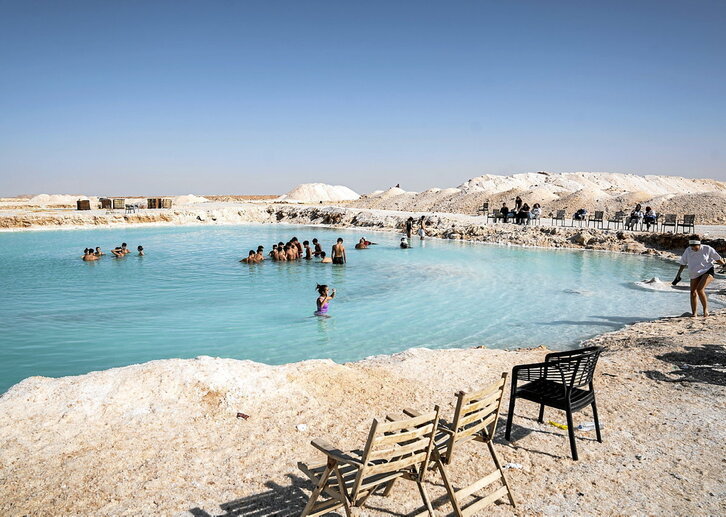 Turistek bainua hartzen dihardute Siwako aintzira gazian, Matrouh-en, Egipton.