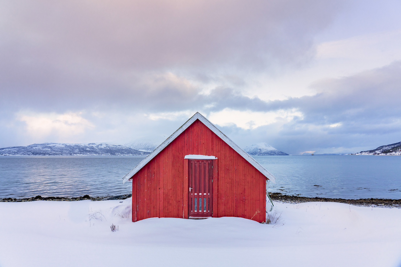 Norvegiako Lofoten uharteen ertzak koloretako etxola txikiz zipriztinduta daude. Rorbuerrak dira, gehienetan gorriz edo laranjaz margotuak.