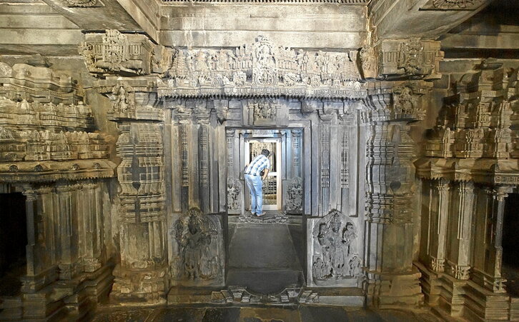 Gizon bat, Somanathapurako Chennakeshava tenpluko sanctum sanctorum-a zulo batetik ikusi nahian, Karnataka estatuan, Indian. 1258an amaituriko tenplu hau Munduko Ondareen zerrendan sartu zuen Unescok, ‘Hoysalen Multzo Sakratuen’ barruan, Halebiduko Hoysaleshwara eta Belurreko Chennakeshava tenpluak bezala.