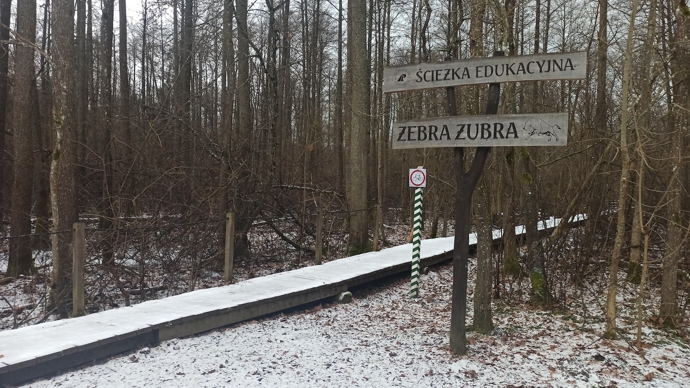 Zebra Zubra parkingean aparkatu ondoren, lau bat kilometrora dagoen Rezerwat Pokazowy Zubrow izeneko animalia erreserbara noa, ur putzuak ekiditeko lurretik altxatuta doan egurrezko pasabidetik.