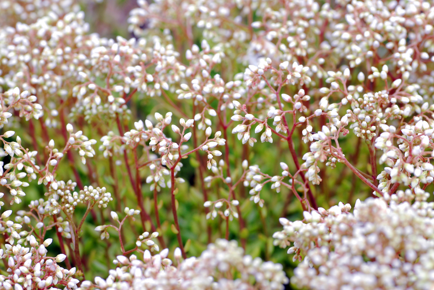 SEDUM ALBUM. Teilatu-belar zuria landare xumea da (8-20 cm) baina multzoetan sortzen denez, erraza da hartaz ohartzea. Loreak txikiak eta zuriak dira; hostoek, zilindrikoak eta haragitsuak, ura gordetzen dute eta horri esker arroketan, hormetan eta teilatuetan ere bizi daiteke. Maiatzetik abuztura loratzen da.