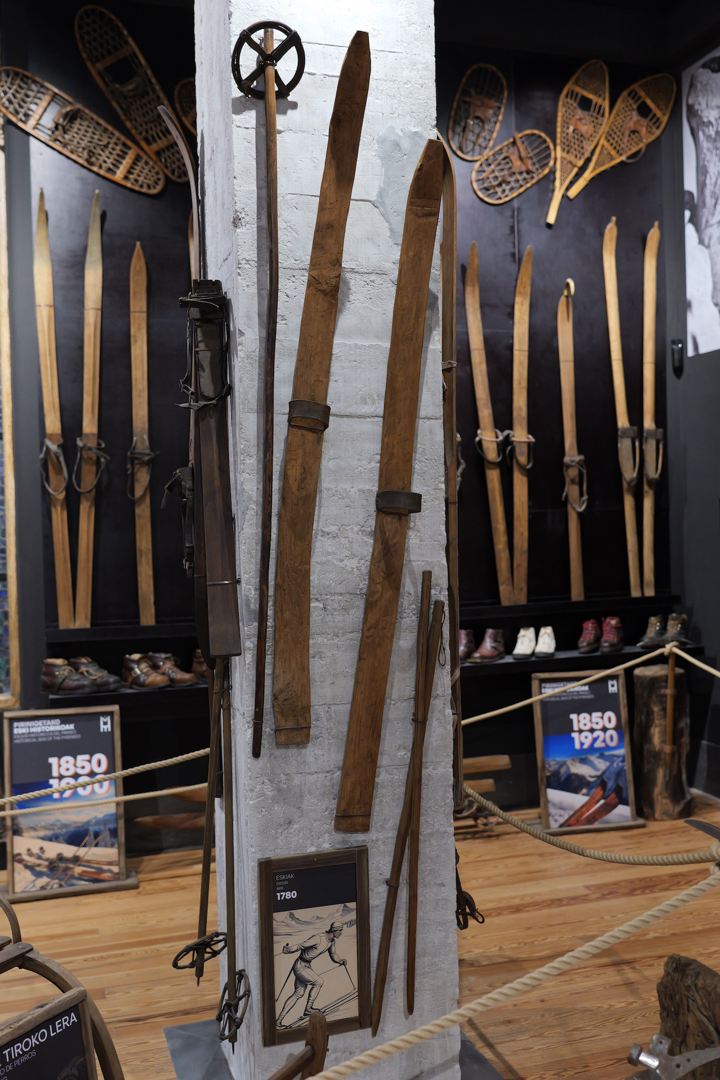Egurrezko eski zaharrak erakutsi ditu Azurmendik, 1780koa da zaharrena, eta azaldu du arestian ez zirela kirola egiteko erabiltzen, elurretan mugitzeko beharrezko tresnak zirela, ez zituztela lagun bi makila, bakarra baizik, eta «arrauna» esaten zitzaiola makilari. Itsas txakurraren ileekin egindako eskiak ere badaude; horien kasuan, ileen norabideak agintzen zuen balazta.