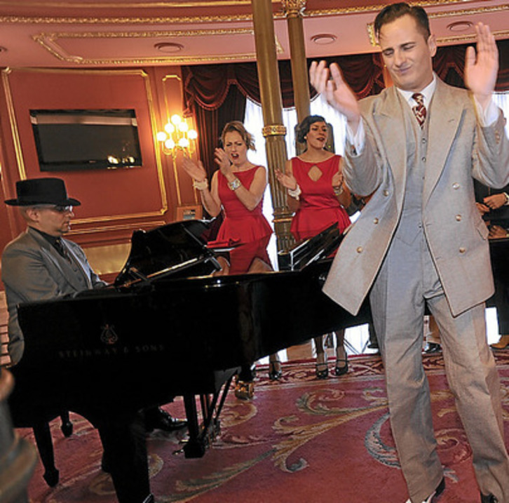 Acompañado por todo el elenco del espectáculo y ataviado como un dandy de mediados del siglo pasado, Etxeandia interpretó la canción «Just a Gigolo/ I Ain't Got Nobody» en la versión que Louis Prima popularizara a fines de los años 50.