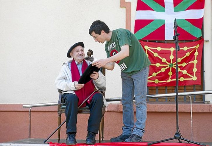 Los actos continuaron en la Plaza de los Fueros de la localidad con el homenaje específico al libertario anarquista nacido en Cascante y que en la actualidad reside en París. Le entregaron una txapela en su honor y la escuela de jotas de Castejón cantó una letra escrita por un militante socialista y republicano. Unas 150 personas siguieron el acto en el que se pudieron ver banderas republicanas y anarquistas, junto a una ikurriña y la bandera de Nafarroa.