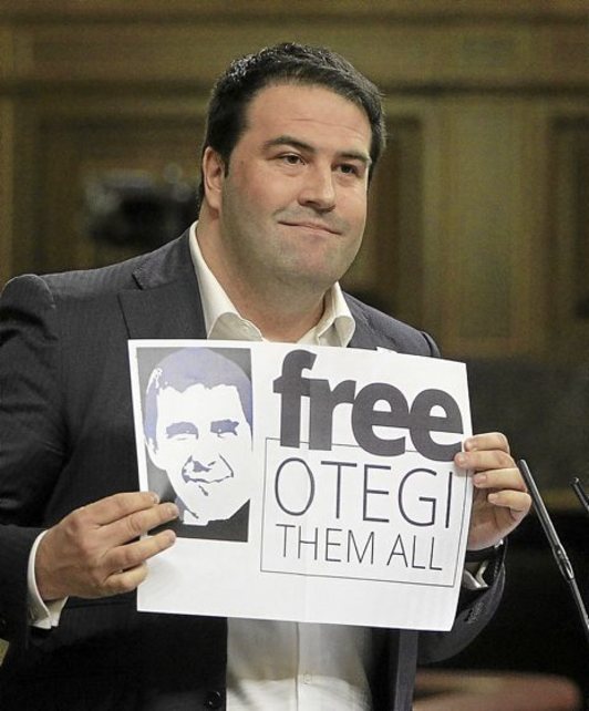 «Aquí, en este Estado, hay numerosos políticos que a día de hoy están en prisión por su actividad política. Ahí tenemos el ejemplo de Arnaldo Otegi y de sus compañeros y compañeras. Personas que están en la cárcel por hacer mera actividad política por el argumento trampa de que ‘todo es ETA’. Por eso, antes de pedir nada a otros estados, hagan sus deberes y liberen al señor Otegi y a sus compañeros». Exhibiendo un cartel con el lema de la campaña internacional «Free Otegi, free them all», el diputado de Amaiur Jon Iñarritu instó ayer al Gobierno español a poner en libertad al secretario general de Sortu y sus compañeros de cautiverio Rafa Díez, Sonia Jacinto, Arkaitz Rodríguez y Miren Zabaleta.