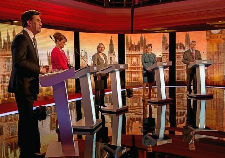Sturgeon subrayó este mensaje en el debate televisado con los dirigentes de los otros cuatro principales partidos de la oposición en el Gran Bretaña: Ed Miliband, del Partido Laborista; Nigel Farage, del eurófobo UKIP; Natalie Bennett, del Partido Verde; y la nacionalista galesa Leanne Wood, de Plaid Cymru. El gran ausente de este careo fue el líder conservador y primer ministro, David Cameron, que solo aceptó participar en un primer debate celebrado el pasado 2 de abril, y también su viceprimer ministro y líder liberaldemócrata, Nick Clegg.