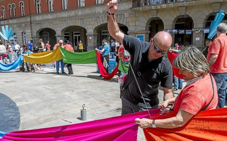 Una vez conseguidas dos coloridas tiras de tela, rodearon el kiosko de la plaza. La megafonía felicitó a los asistentes y les dijo que ese no es más que un pequeño ejemplo para que se hagan a la idea de lo que será el 21 de junio. A su vez, indicó que son necesarios muchos pedazos de tela más, más adhesiones en Erandio y en toda Euskal Herria.