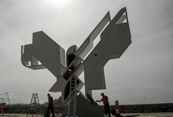 La “Paloma de la Paz” de Nestor Basterretxea se trasladó ayer a Sagués desde Amara. Completará, junto con las grandes obras de Oteiza y Chillida, el eje de trabajos escultóricos situados frente al mar. La “Paloma de la Paz” se inauguró en 1988 en el Paseo de la Zurriola, para trasladarde a Amara debido a las obras de construcción del Kursaal. Jagoba MANTEROLA | ARGAZKI PRESS