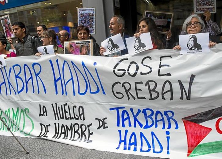 Varias organizaciones y partidos, junto a la comunidad saharaui de Bilbo, comenzaron ayer en una jaima instalada en la plaza Moyua un ayuno de 24 horas en solidaridad con la saharaui Takbar Haddi, que lleva más de un mes en huelga de hambre ante el consulado de Marruecos en Las Palmas de Gran Canaria para denunciar «el asesinato a manos de los médicos, la Policía y las autoridades marroquíes» de su hijo, Mohamed Lamin Haidala, y exigir la entrega de sus restos.