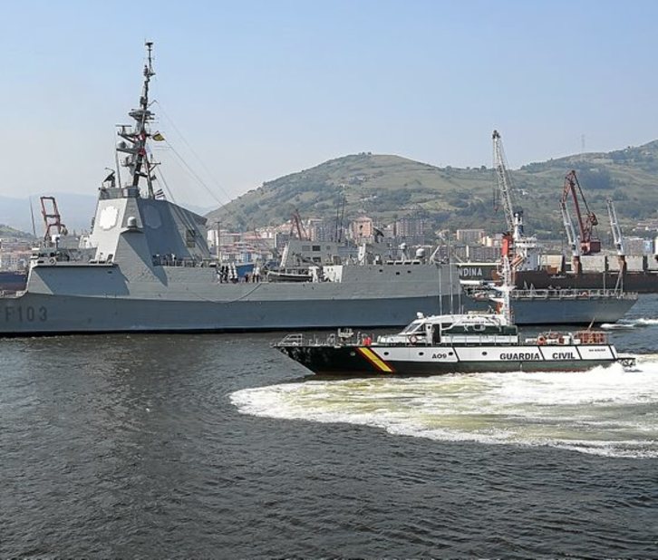 A las 11.30, medio centenar de personas partieron desde Ereaga hasta Arriluze tras una pancarta con el lema ‘‘Ez zarete ongi etorriak, alde hemendik! ¡Que se vayan!’’. Entre consignas de «alde hemendik, utzi bakean» y coreando la popular canción ‘‘Qué se vayan’’, los manifestantes llegaron hasta el área portuaria, custodiada por efectivos de la Brigada Móvil de la Ertzaintza, Guardia Civil, Policía española y militares. En el agua, varios buzos se sumergían en el área donde iba a fondear la fragata para reconocerla.