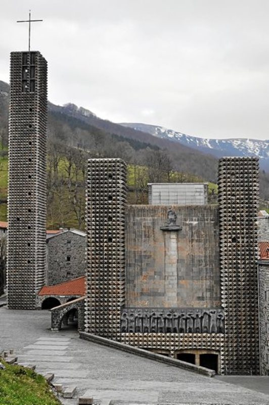 La foto de Arantzazu señala un monumento apoteósico de la creatividad vasca, arquitectura, escultura, pintura, vidrieras, su condición de archivo, y que como conjunto monumental crea un lugar en sentido antropológico y espiritual y consecuentemente una referencia universal del arte en Euskal Herria.