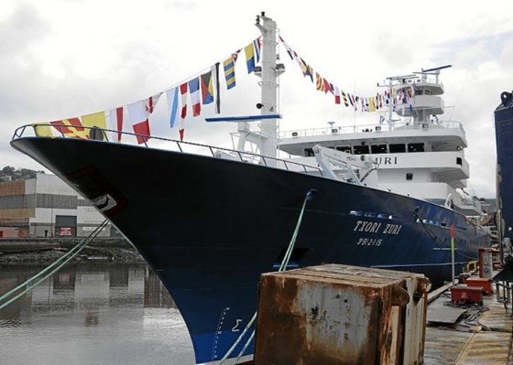 “Txori Zuri”, que así se llama el barco, fue bendecido ayer por la mañana en las instalaciones de Astilleros Murueta en Erandio. La empresa destacó la «relación de largo recorrido» que mantiene con la compañía Inpesca, para la que ha construido ya cinco atuneros congeladores: “Txori Toki” (2000), “Txori Argi” (2004), “Txori Gorri” (2007) e “Itsas Txori” (2013).