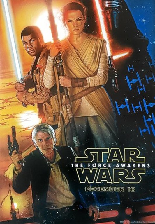 Este cartel, que incluye a John Boyega en el papel de Finn, a Daisy Ridley como Rey, a Adam Driver como Kylo Ren y Harrison Ford, de nuevo como Han Solo, mantiene el estilo reconocible de Struzan, el cual ha vuelto a apostar por un estilo de retrato muy realista pero sin caer en la copia cuasi fotográfica. Disney también aprovechó la ocasión para dar a conocer el nombre del tercer cineasta que completará esta nueva trilogía.