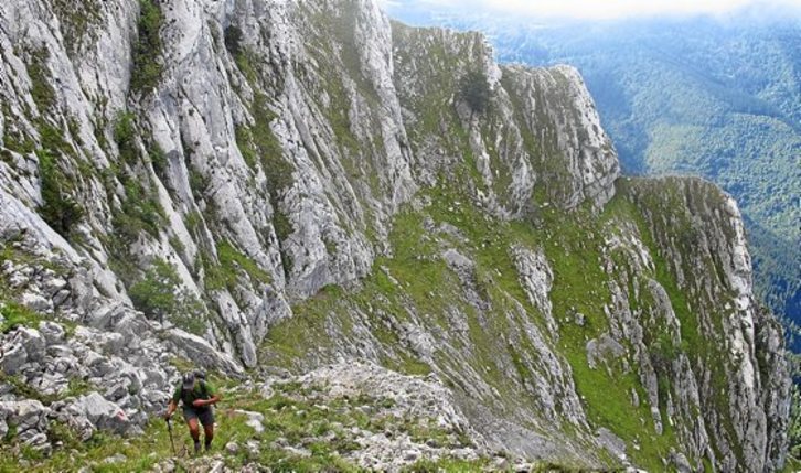Frente a nuestra vista aparece ahora claramente dibujada la fina línea de sendero que va a flanquear audazmente la ladera por encima de la pedriza de Markuarre buscando el camino hacia la cumbre. Siempre pisando con atención, vamos festoneando la pendiente hacia un empinado corredor que desemboca en la cresta cimera. Si miramos hacia atrás, contemplaremos ahora en toda su dimensión montañera la belleza del sendero que hemos recorrido. Sólo nos resta ya salvar el breve tramo que nos separa de la cima de Untzillaitz (924 m) (2,05 h).