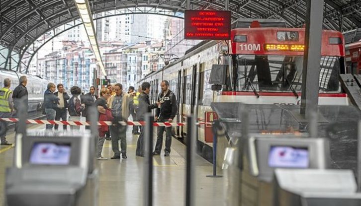 El suceso se registró sobre las 8.15, por causas que aún se desconocen, cuando la unidad que llegaba a la estación de Abando, procedente de Orduña, frenó pero no logró detenerse y chocó con la topera hidráulica.