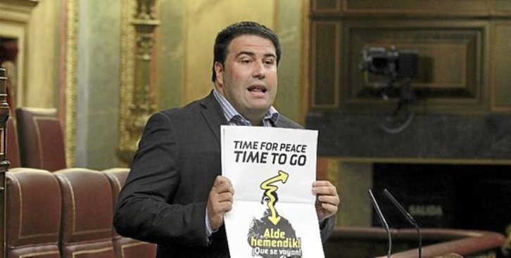 «Time to peace, time to go. Alde hemendik». Desde el estrado del Congreso, el diputado de Amaiur, Jon Iñarritu, exigió ayer a través de un cartel la salida de Policía española y Guardia Civil de Euskal Herria.